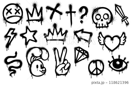 Graffiti spray paint, grunge ink elements of vector street art. Black spray paint heart, star, crown, dead smile emoji and peace symbol, drips and splashes. Graffiti arrow, skull, lightning and eye