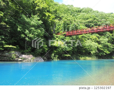 初夏的大元太湖和大元太山,新潟縣湯澤町鐵橋上的風景