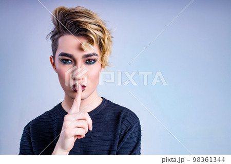 Closeup portrait of a young man with a lipstick over white background