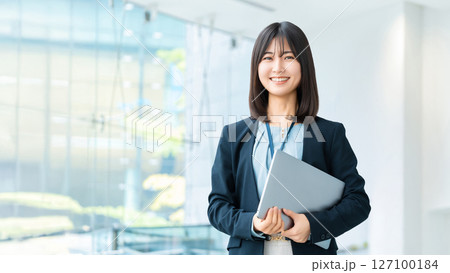 帶筆記型電腦的微笑的女人/女商人