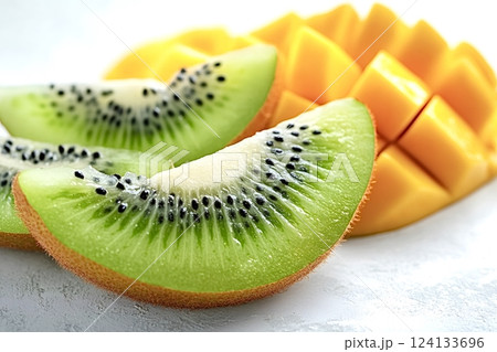 Sliced kiwi fruit and mango showing refreshing juicy pulp