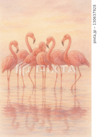 湖面上紅白鶴群倒影|浪漫水彩畫