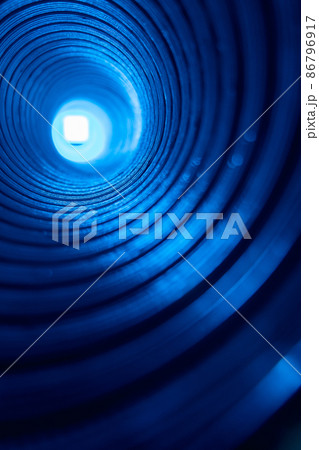 Defocused neon glow. Futuristic background. Fantasy tunnel. Blur fluorescent blue color round spotlight in ripple whirl texture pipe on dark black empty space.