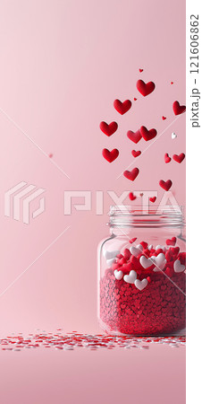 Glass jar full of heart shaped confetti on pink background. Valentines background. Love banner