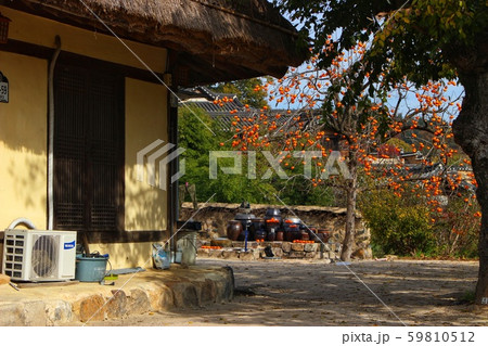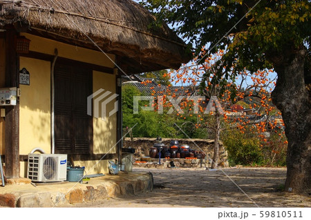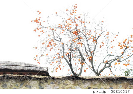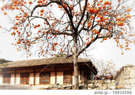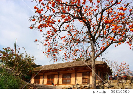 韓國風景,風景攝影,韓國的秋天,茅草的房子,柿子樹,韓屋,柿子樹的風景,秋天的風景,鄉間別墅,