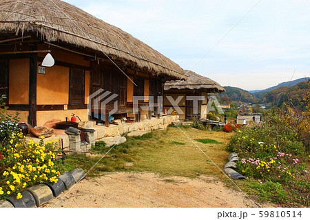 韓國風景,風景攝影,韓國的秋天,茅草屋,院子裡的房屋,韓屋,o石屋,野菊花,時代房屋,秋天風景,鄉村房屋,