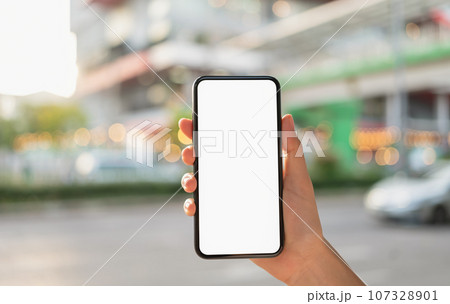 Hand holding black smartphone with blank screen for graphic display montage at shopping mall.