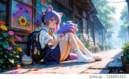 Playful Anime Cat Girl Student Outdoors with Colorful Flowers
