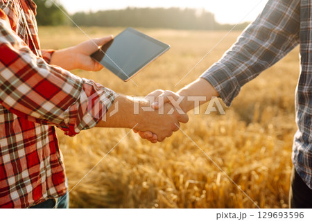Handshake, joint work of farmers. Two farmers making agreement with handshake in wheat field.