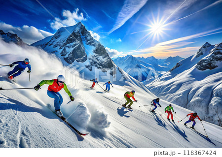Dynamic Winter Sports Scene with Skiers and Bright Sun