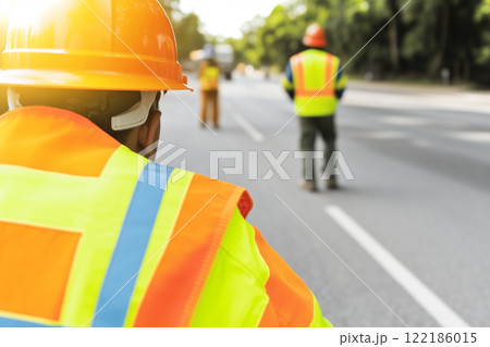 Construction Team in Safety Gear Working Together on Road Construction Site