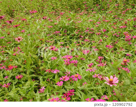 Sunny summer day.In a flower bed in a large number various zinnias grow and blossom.