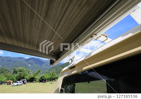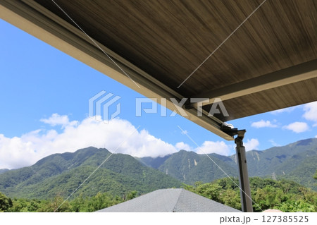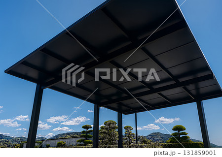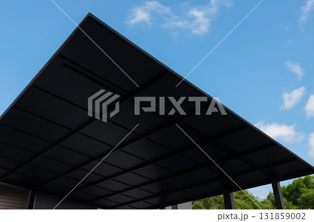 美麗的戶外場景,黑色聚碳酸酯屋頂車棚和漂浮在晴朗藍天上的雲朵(AI 生成的圖像)