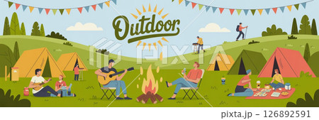 Diverse group celebrating pride with rainbow flag at outdoor camping site vector illustration