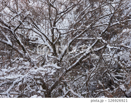 冬季山林中枯枝繁葉茂的雪景