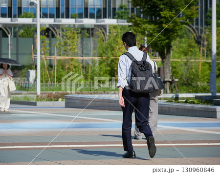 夏日清晨,一位上班族穿過金澤站西廣場去上班