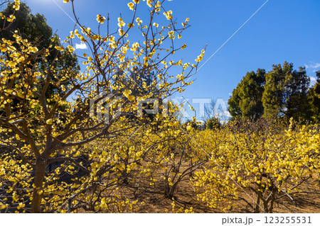 埼玉縣所澤市所澤航空紀念公園蠟梅園的明黃色蠟梅和藍天