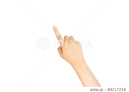 Young woman hand touch screen gesture isolated on white background