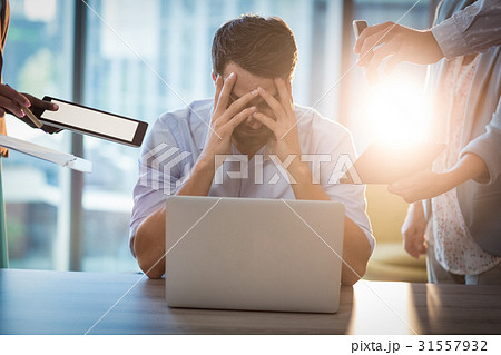 Stressed businessman sitting at kitchen counter table with laptop, wine glass and bottle. African man in white shirt rubbing forehead and looking troubled with hard working at home.