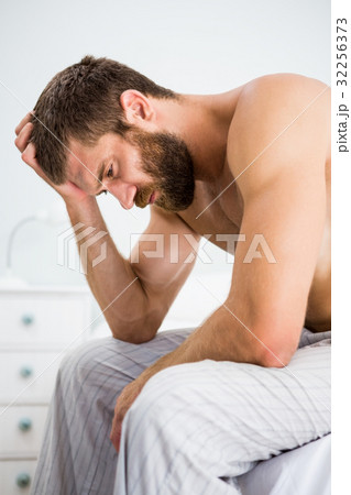 Sitting woman gazing down at bed edge in bedroom, with beige headboard, sheets, gray pillow, window