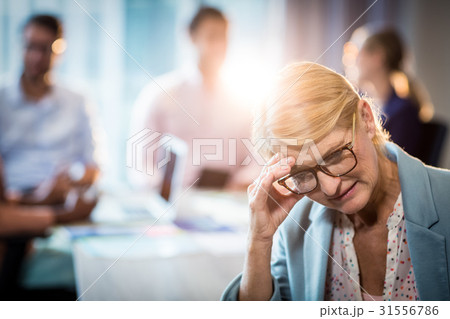 Freelance concept, Worried Asian businesswoman reading documents with a hand on her head, working on a laptop in a busy cafe environment.