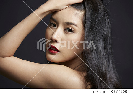 portrait of a beautiful young caucasian woman, head up, eyes closed, hand on forehead,