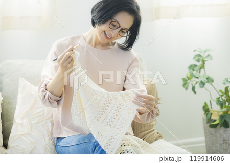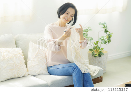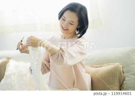 Cozy Setup. Cream-colored yarns skeins and knitting needles on a white background.