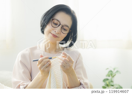 一位中年婦女在客廳織毛衣