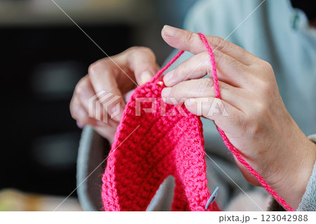 Heart shape created from red yarn on minimalistic red background with copy space. Knitting and love themes