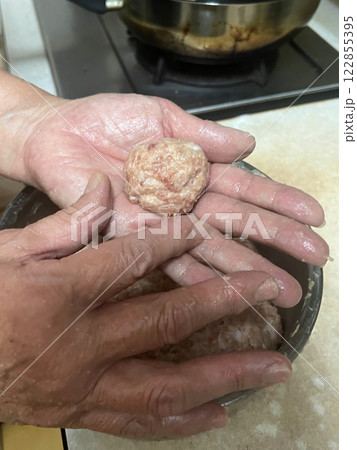拍攝媽媽將豬肉末捏成圓形準備放入鍋中料理