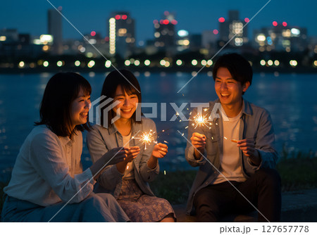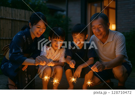 夏天,孩子們穿著浴衣和甚平,享受手持煙火