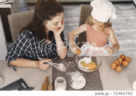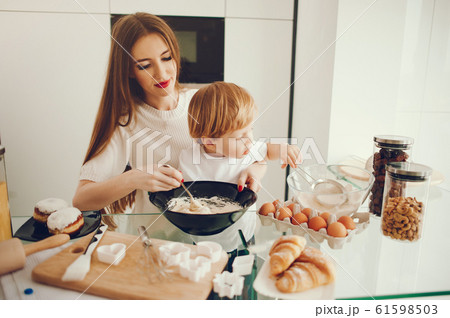 Little boy learning to whisk eggs for dough while standing close to his mother