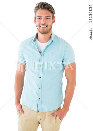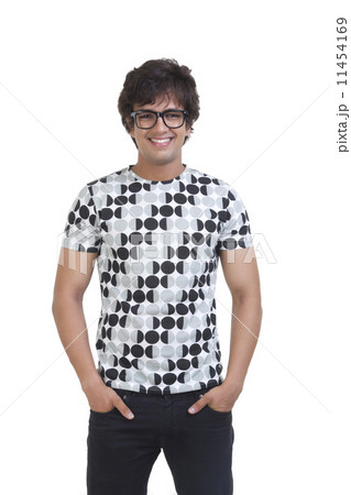Man in shirt, T shirt and jeans standing with hand in pocket against light grey wall