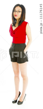 Woman casual Japanese painting standing relaxed orange shirt green pants