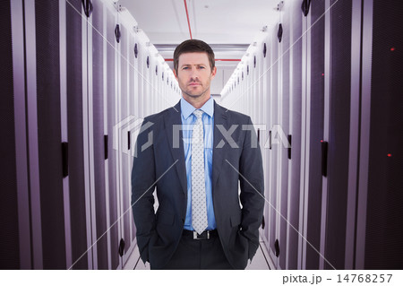 Male office worker standing in office wearing blue sweater near digital tablet and glass partition