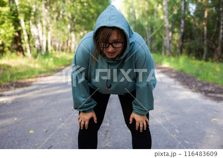 With her hands on her knees, a woman catches her breath after a long run. Sweat runs down the face of a plump woman after a cardio workout by running. A woman rests after a run.