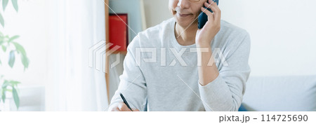 中年男子一邊用智慧型手機說話一邊做筆記
