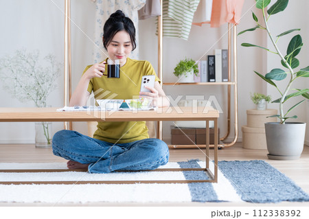 坐在沙發上使用智能手機的女人