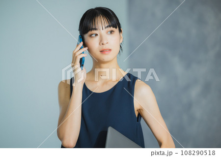 20多歲女性美麗形象(智慧型手機、黑長髮、無袖)
