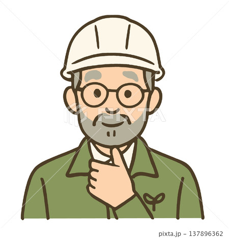 Elderly man, construction worker, safety helmet, glasses, beard, thoughtful expression