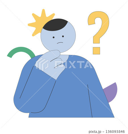 Flat vector illustration of a confused person thinking and touching chin with question mark and abstract shapes in modern minimal style on white background.