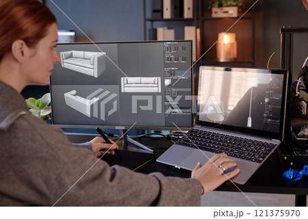 Woman working at desk with dual monitors and laptop, focusing on 3D modeling of furniture. Screens displaying detailed 3D designs of couch