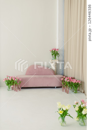 An elegantly designed interior showcases a minimalist pink sofa that is beautifully complemented by an arrangement of fresh flowers, creating a harmonious and inviting atmosphere for relaxation