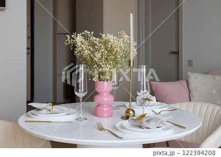 An Elegant Dining Setup Featuring a Delightful Pink Vase Accompanied by White Flowers