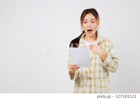 A financial burden grows as the shocked woman reads overdue bills, worried about mounting financial stress and money problems. isolated studio white background