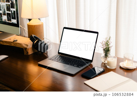 Desk Laptop with blank screen on table blur background with bokeh