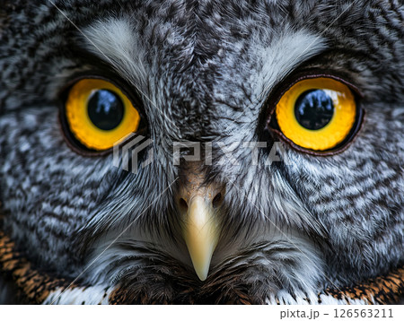 Closeup of great gray owl face. ,Carnivorous bird with amber eyes. AI Generated.