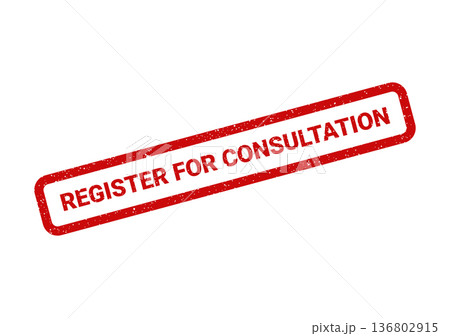 Distressed rectangular stamp in grunge style featuring bold text for consultation registration process call to action