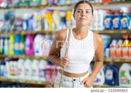 Girl in supermarket sales area looks into distance and searches for necessary goods
