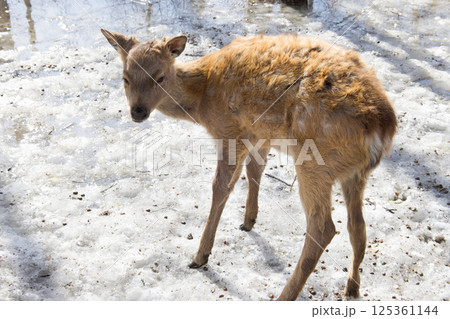 female of wild deer searches for food in the Ust-Kamenogorsk City Park in Eastern Kazakhstan during daytime snowmelt.